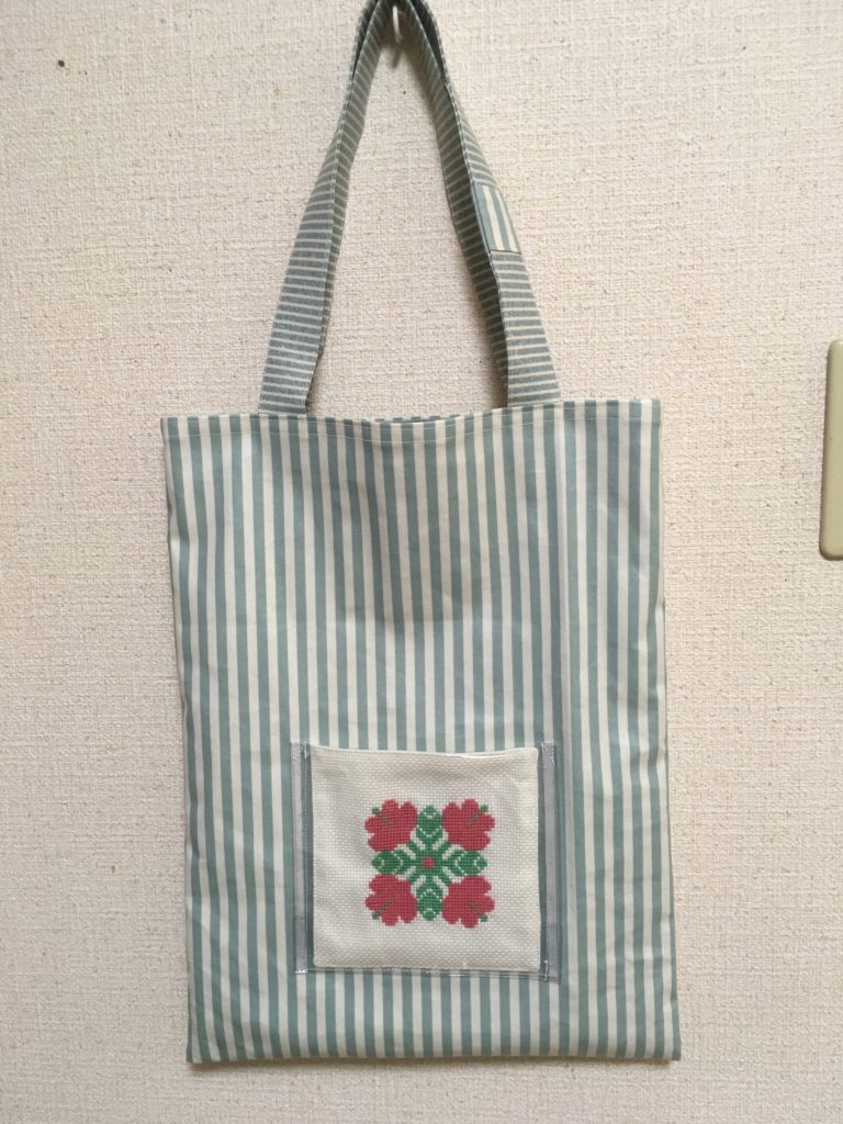 ラミネート生地で水に濡れても大丈夫。ポケットのクロスステッチのお花がポイントです。