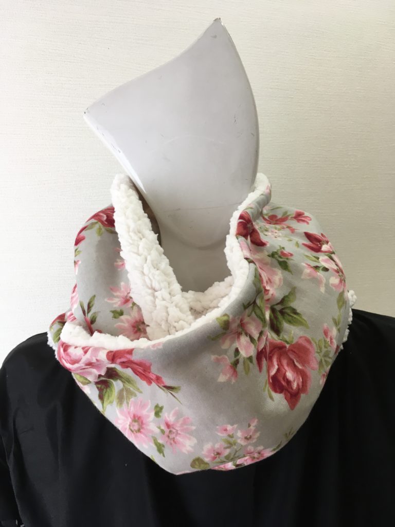 ちょっと長めのスヌードで花柄のガーゼ生地は、肌さわりも柔らかく明るい表情に。