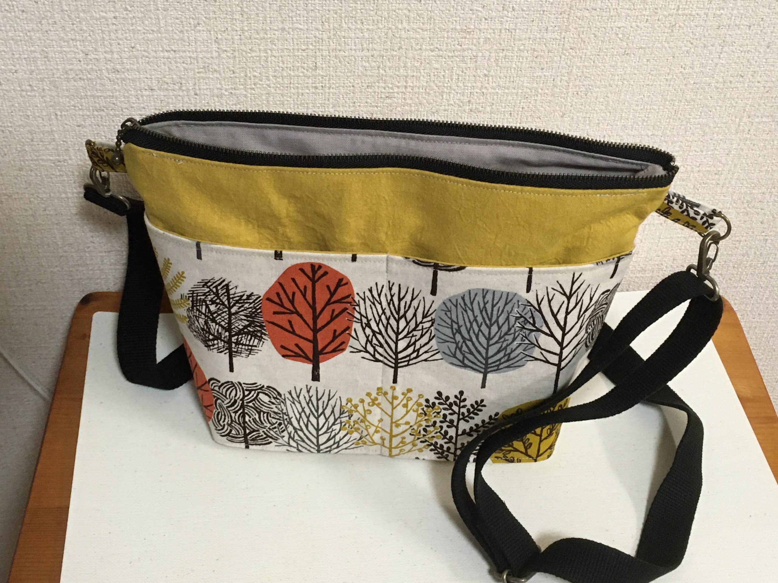 外側にはファスナーポケットと仕切りポケットが有り、内側にもグルっと一周仕切りポケットがあります。