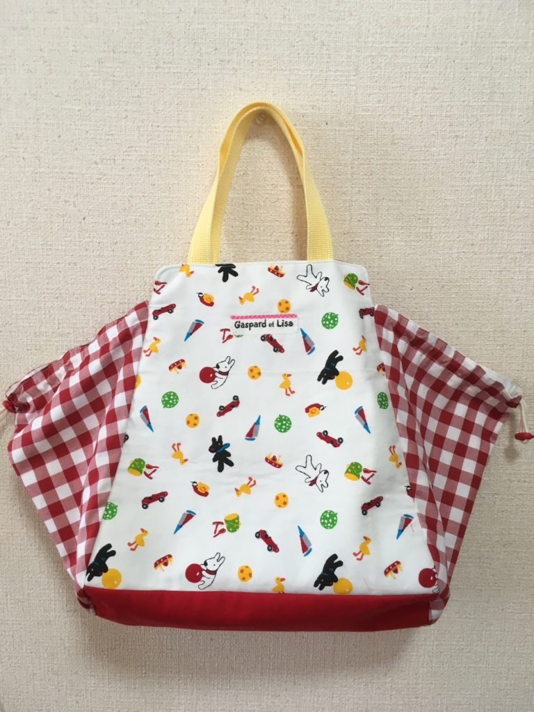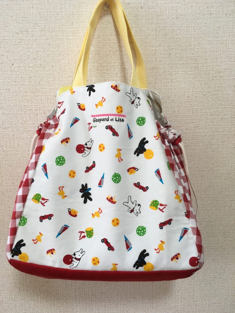 サイドの紐を絞ると可愛い巾着バッグになります。紐を伸ばせば入れ口ゆったりで楽に出し入れができます。