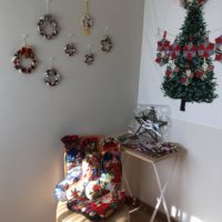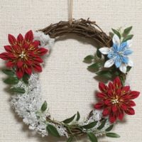 リースにつまみ細工のポインセチアを飾りました。 径 20cm 価格 2,500円 エコクラフトの星形リース 径 30センチ 価格 1,500円