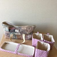 中はこんな状態です。 携帯に便利な裁縫セットです。針山も可愛いです。 横15×縦10×幅10 価格 3.800円