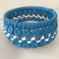 花編みで作った丸いかごは涼しげな小物入れに。(中敷き付き) 直径 約20cm 高さ9cm 価格 各 2,000円