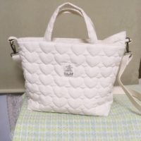ハート型のキルティングが可愛らしい、オフホワイトのトートバッグです。ナチュラルな色合いで、どんなコーディネートにも合わせやすいデザインです。フロントには「BOTANICAL PLACE」のロゴがあしらわれており、さ …
