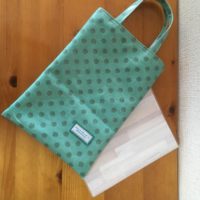 B6サイズのノートがスッポリ入ります。 表生地はラミネートなので雨の日のちょっとしたお買い物に。お財布、携帯、エコバッグ。 横16×縦24 価格 600円